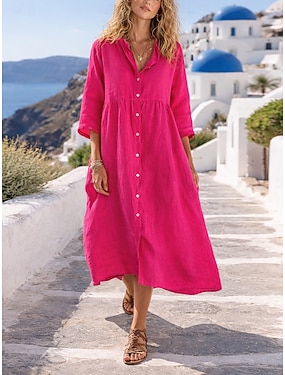 Damen Midikleid Kunstbaumwollleinen Hemdblusenkleid Freizeitkleid A Linie Kleid Mode Modern Täglich Urlaub Ausgehen Normale Passform Einfach Langarm Hemdkragen Rosa Frühling Herbst