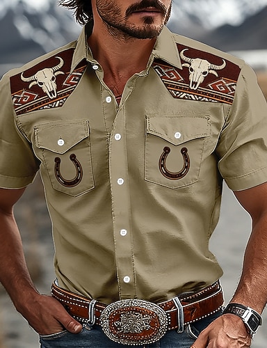 Herren Kuhmuster Ethnisch Hufeisen Westernhemd Knopfhemd Cowboy-Shirt Kurzarm Western Vintage-Retro Lässig Outdoor Arbeitskleidung Sommer Frühling Umlegekragen 3D-Druck Zwei Fronttaschen Hemden mit