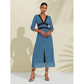 Damen Weiblich Freizeitkleid Midikleid Blau 3/4 Ärmel Ketten drucken Sommer Frühling Frühling & Herbst V Ausschnitt Elegant Urlaub XS S M