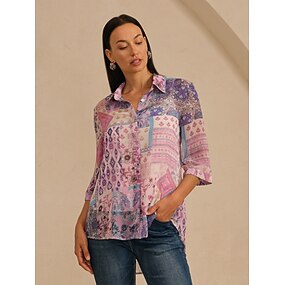 Damenbluse hellviolett Bohemien Kombinationsdruck Hemdkragen vorne falsche Knopfleiste lässig Urlaub Reisen Frühling Herbst