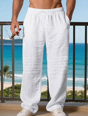 Herren Leinenhosen Hose Sommerhose Strandhose Kordelzug Elastischer Bund Gerader Schnitt Einfach Komfort Atmungsaktiv Volle Länge Lässig Täglich Ferien Urlaub Mode Weiß Himmelblau