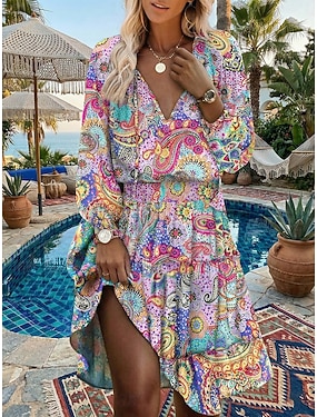 Damen Midikleid Sommerkleid Freizeitkleid A Linie Kleid Urlaub Lässig Boho Strand Party Ferien Lässiger Schnitt Blumen Grafik Paisley-Muster Langarm V Ausschnitt Blau Magenta Orange Frühling Herbst