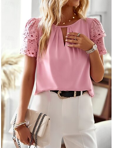 Damen Bluse Spitze Patchwork Einfarbig Stilvoll Lässig Kurzarm Rundhalsausschnitt Normale Oberteile Täglich Rosa Sommer Frühling