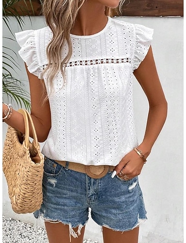 Damen Popover-Hemd Sommerhemd Freizeithemd Bluse Spitze Lochmuster Knöpfe Blumen Urlaub Lässig Kurzarm V Ausschnitt Normale Oberteile Täglich Ferien Weiß Sommer Frühling