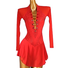 Eiskunstlaufkleid Damen Mädchen Eislaufen Kleider Rot Patchwork Rückenfrei Gitter Spandex Hochelastisch Ausbildung Wettbewerb Eiskunstlaufkleidung Klassisch Kristalle Langarm Eislaufen Eiskundstlauf