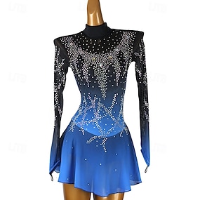Eiskunstlaufkleid Damen Mädchen Eislaufen Kleider Blau Daumenloch Halo-Färbung Gitter Spandex elastisch Ausbildung Praxis Professionell Eiskunstlaufkleidung warm Klassisch Kristalle Langarm Eislaufen