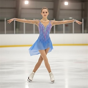 Eiskunstlaufkleid Mädchen Eislaufen Kleid Himmelblau Patchwork Asymmetrischer Saum Dehnbar Training Wettbewerb Eiskunstlaufkleidung Klassisch Kristall / Strass Langarm Eislaufen Eiskundstlauf