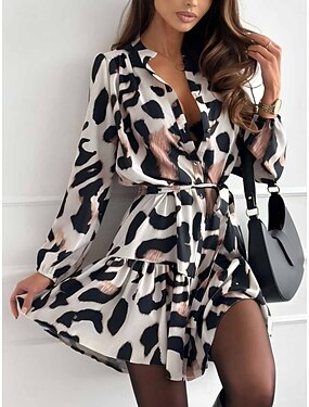Damen Minikleid Freizeitkleid Druckkleid Mode Modern Täglich Strand Wochenende Normale Passform Leopard Langarm V Ausschnitt Braun Sommer Frühling Herbst