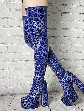 Sexy blaue Plateaustiefel mit Leopardenmuster und klobigem Absatz für Damen – auffälliges Schuhwerk für Partys, Events und Abende