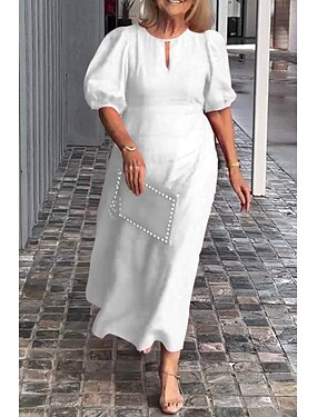 Damen Midikleid Kunstbaumwollleinen Shiftkleid Freizeitkleid Mode Puffärmel Täglich Urlaub Ausgehen Normale Passform Einfach Kurzarm Rundhalsausschnitt Weiß Gelb Rote Sommer