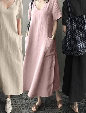 Frauen Leinenähnliche Faux Baumwoll Leinen Maxi Kleid Etuikleid Shift Kleid Sommer Kleid Urlaub Party Lässig Alltäglich Büro Party Lockerer Schnitt Unifarben Kurzarm V-Ausschnitt Schwarz Pink