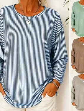 Damen Hemd Bluse Kunstbaumwollleinen Gestreift Stilvoll Modern Langarm Rundhalsausschnitt Normale Oberteile Täglich Ferien Ausgehen Hellgrün Himmelblau Braun Aprikose Sommer Frühling