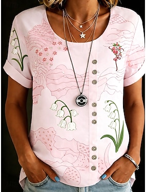 Damen Bluse Knöpfe Druck Blumen Grafik Vintage Tropisch Stilvoll Kurzarm Rundhalsausschnitt Normale Oberteile Ferien Blau Rosa Braun Sommer Frühling