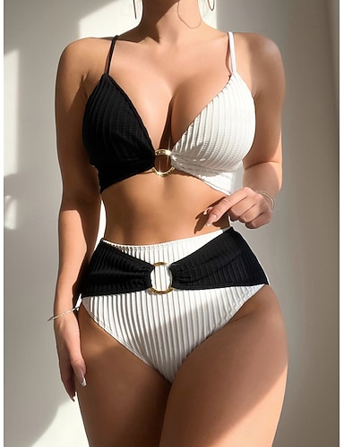 Damen Bikini 2-teilig Badeanzug Unterdraht Colorblock Slips Slim Rückenfrei Urlaub Strandbekleidung Unifarbener V Ausschnitt Ärmellose Badeanzüge