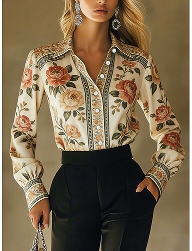 Damen Hemd Bluse Knöpfe Druck Blume Modern Lässig Langarm Hemdkragen Normale Oberteile Ferien Ausgehen Schwarz Marineblau Orange Grün Grau Sommer