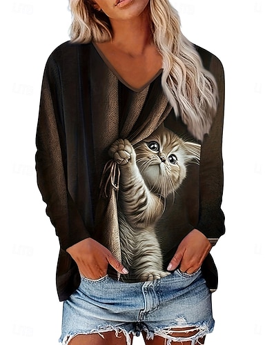 Damen T Shirt Druck Grafik Tiermotiv 3D Vintage Stilvoll Klassisch Langarm V Ausschnitt Normale Oberteile Täglich Braun Herbst Winter