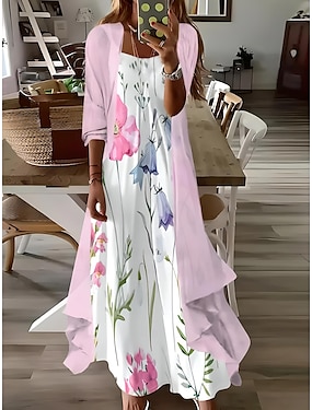 Damen Maxikleid 2-teiliges Kleid Set Sommerkleid Slip Kleid Urlaub Formal Boho Urlaub Lässige Passform Floral Grafik 3/4-lange Ärmel Träger V-Ausschnitt Rosa Sommer Frühling