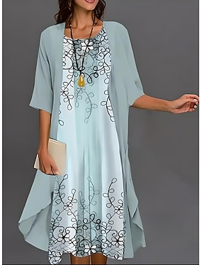 Damen Kleid Set Midi Kleid Sommerkleid Lässig Semi-Formal Floral Grafik Druck 3/4 Länge Ärmel Rundhals Alltag Urlaub Blau Lila Grün Sommer Frühling Regulär Fit