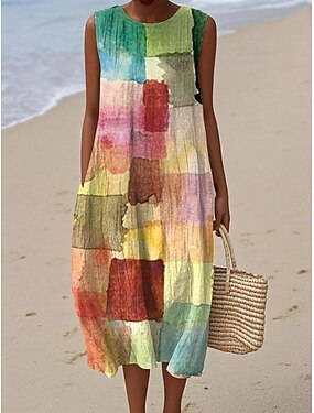 Damen Midikleid Shiftkleid Sommerkleid A Linie Kleid Urlaub Lässig Boho Strand Ausgehen Lässiger Schnitt Grafik Geometrisch Ärmellos Rundhalsausschnitt Purpur Grün Sommer Frühling