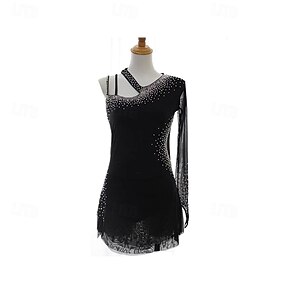 Eiskunstlaufkleid Damen Eislaufen Kleid Schwarz Patchwork Asymmetrischer Saum Dehnbar Training Wettbewerb Eiskunstlaufkleidung Klassisch Kristall / Strass Langarm Eislaufen Eiskundstlauf
