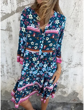 Damen Midikleid A Linie Kleid Boho-Kleid Stilvoll Brautkleider schlicht Urlaub Täglich Regular Fit Blumen 3/4 Ärmel V Ausschnitt Marineblau Königliches Blau Purpur Frühling Herbst
