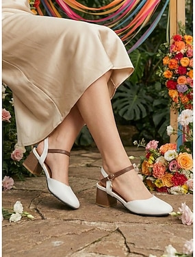 Weiße Mary-Jane-Brautschuhe mit niedrigem Absatz für Damen – eleganter Brautstil für Gartenhochzeiten im Freien