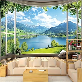 3D-Wandteppich mit Seeblick, Naturlandschaft aus dem Fenster, Waldmotiv, künstliche Fensterkulisse für Wohnzimmer, Yogaraum und Meditationsraum