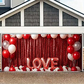 Garagentorabdeckung zum Valentinstag, Ballonhaufen mit rotem Paillettenvorhang, roten und weißen Rosen, roter „Love“-Ballon – die perfekte Festtagsdekoration für Zuhause oder Schaufenster.