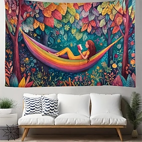 Wandteppich mit verspieltem Mädchen, das in einer Regenbogen-Hängematte liest – ein magischer Wald mit bunten Bäumen und Blumen – ästhetische Kunst für Schlafzimmer, Leseecke oder Bibliothek.
