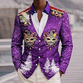 Karneval Herren Karnival Falsches Kragen- und Anzugdesign Maske mit Federn Hemd Knopfhemd Langarm Modisch lässig Party Ferien Frühling Herbst Umlegekragen 3D-Druck Hemden mit Kragen Purpur Grün