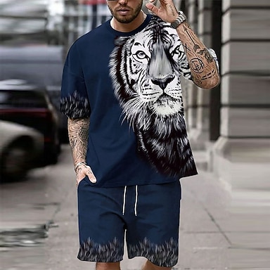 Herren Tiger 2St T-Shirts-Sets Sommeroberteile Kurzarm Kurze Hosen Rundhalsausschnitt Sport Lässig Outdoor Urlaub Sport 3D-Druck Sommer Grau Dunkel Blau Rot