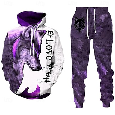 Herren Wolf 2St 3D Sweatshirt-Sets Trainingsanzug Kapuzensweatshirt Langarm Lange Hosen Mit Kapuze Streetwear Alltagstauglich Athleisure 3D-Druck Grafik Frühling Herbst Winter Violett Rote