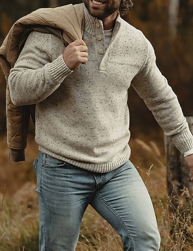 Herren Pullover Strickpullover Gerippt Stricken Normale Oberteile Knöpfe Gestrickt Einfach Henley Mode Basic Urlaub Alltagskleidung Bekleidung Herbst Winter Schwarz Weiß S M L
