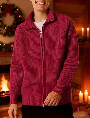 Herren Weihnachtspullover Strickjacke Kurzer Pullover Reißverschluss-Pullover Strickpullover Gerippt Stricken Normale Oberteile Tasche Vollreißverschluss Einfach Stehkragen Weihnachten Mode Urlaub