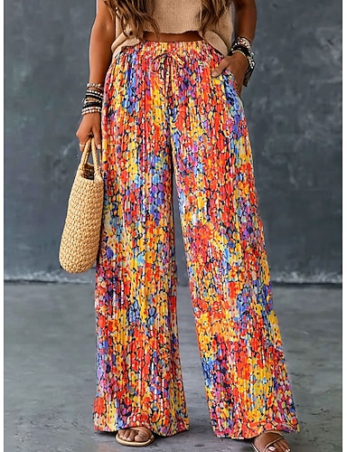 Damen Weites Bein Chinos Urlaub Vintage Ethno-Stil Volle Länge Hohe Taille Blumen Grafik Kordelzug Drucken Schnelltrocknend Atmungsaktivität Weich Unelastisch Lässig Outdoor Urlaub Rote Orange Grün