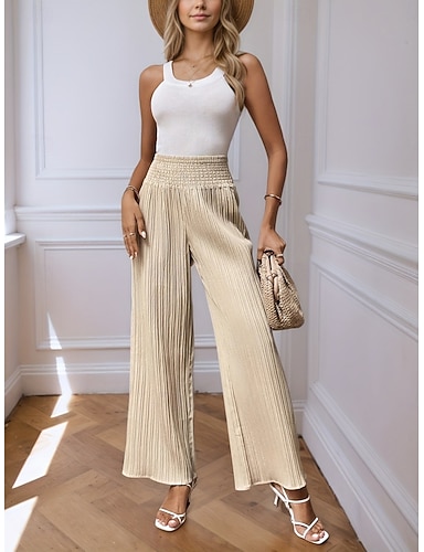 Damen Weites Bein Chinos Urlaub Mode Streetwear Volle Länge Hohe Taille Einfach Plissiert Elastischer Bund Bequem Weich Dehnbar Täglich Outdoor Straße Aprikose Sommer Frühling Herbst Lässiger Schnitt