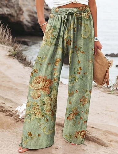 Damen Leinen-inspirierte Hosen Weites Bein Palazzo-Hose Mode Boho Volle Länge Hohe Taille Blume Elastischer Bund Bequem Atmungsaktiv Mikroelastisch Straße Alltagskleidung Ausgehen Grün Grau Sommer