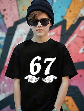 T-Shirt für Jungen aus 100 % Baumwolle mit lustigem Slang-Aufdruck „67“ in Schwarz, Weiß und Rot. Grafikdruck, Rundhalsausschnitt, Kurzarm, ideal für Outdoor, Alltag, Freizeit, Streetwear und Sommer.