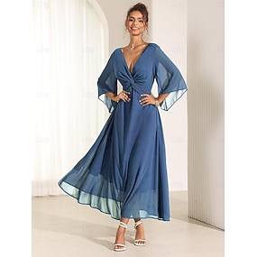 Cocktailkleid für Hochzeitsgäste aus Chiffon mit einfarbigen Rüschen und gedrehten, eleganten Sommer-Maxikleider mit V-Ausschnitt und ausgestellten 3/4-Ärmeln