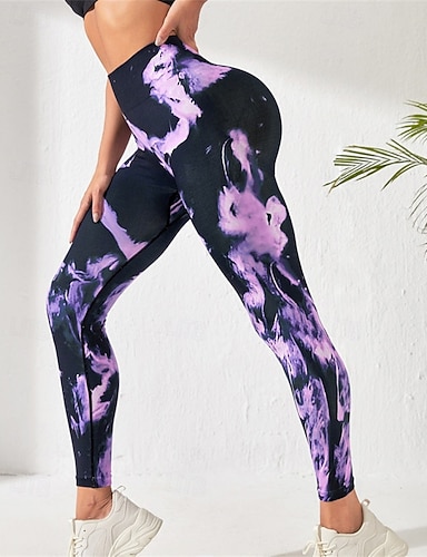 Damen Yogahose Yoga-Leggings Elastischer Bund Po-Lifting Bauchkontrolle Pilates Fitnesstraining Training Hosen Batik Purpur Herbst Sport Sportkleidung Dehnbar Schlank