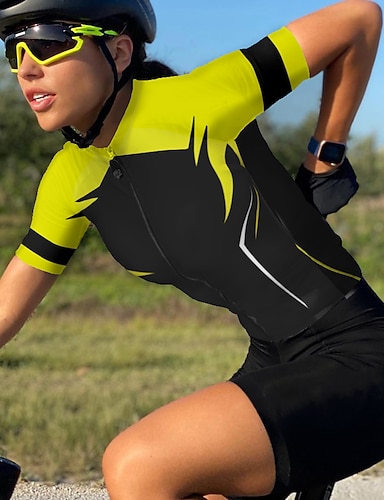 Damen Radtrikot Geometrisch Kurzarm Fahhrad Trikot Oberteil mit 3 Gesäßtaschen Mountainbike MTB Straßenradsport Schnelltrocknend Reflektierende Streifen Rückentasche Feuchtigkeitsableitend Sport Gelb