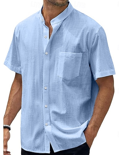 Herren Hemd Leinenhemd Popover-Hemd Freizeithemd Baumwollhemd Einfach Urlaub Straße Weiß Marineblau Blau Beige Kurzarm Stehkragen Sommer Bekleidung