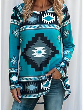Damen T Shirt Druck Grafik Geometrie Vintage Stilvoll Lässig Langarm Rundhalsausschnitt Normale Oberteile Täglich Blau Grau Herbst Winter