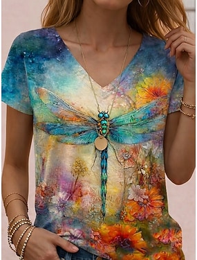Damen T Shirt Druck Blumen Grafik Libelle Stilvoll Klassisch Lässig Kurzarm V Ausschnitt Lange Oberteile Täglich Weiß Rosa Purpur Grün Sommer Frühling