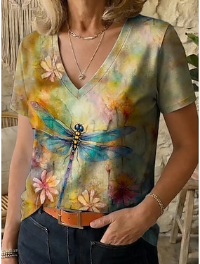 Damen T Shirt Druck Blumen Grafik Stilvoll Lässig Kurzarm V Ausschnitt Normale Oberteile Täglich Grün Sommer Frühling