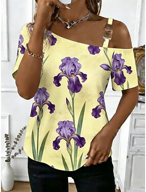 Damen T Shirt T-Shirt Druck Blumen Grafik Stilvoll Klassisch Lässig Kurzarm Asymmetrischer Ausschnitt Normale Oberteile Täglich Ausgehen Wochenende Blau Gelb Rosa Sommer Frühling