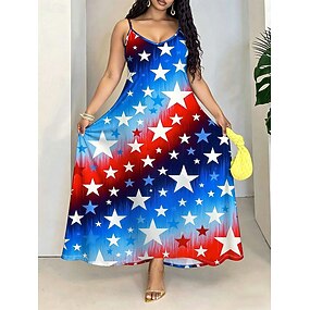 Amerikanischer Unabhängigkeitstag Damen Maxikleid A Linie Kleid Unterkleid Urlaub Lässig Strand Ausgehen Normale Passform Grafik Stern Ärmellos V Ausschnitt Blau Rote Sommer Frühling
