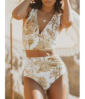 Bikini für Frauen 2-teilig Badeanzug Geraffte Palm-Badehose Rückenfrei Schlank Urlaub Strandbekleidung Tropisch V-Ausschnitt Ärmellose Badeanzüge
