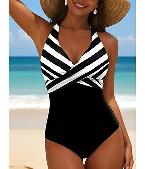 Damen Einteiler Badeanzug Figurbetonend Farbblock Monokini Hoher Schnitt Bauchkontrolle Hohe Taille Schlank Rückenfrei Urlaub Vintage Ombre Grafik V-Ausschnitt Ärmellos Badeanzüge