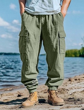 Herren Cargohose Leinenhosen Sommerhose Freizeithose Kordelzug Elastischer Bund Mehrere Taschen Einfach Komfort Atmungsaktiv Volle Länge Lässig Täglich Strand Urlaub Mode Blau Schwarz Unelastisch